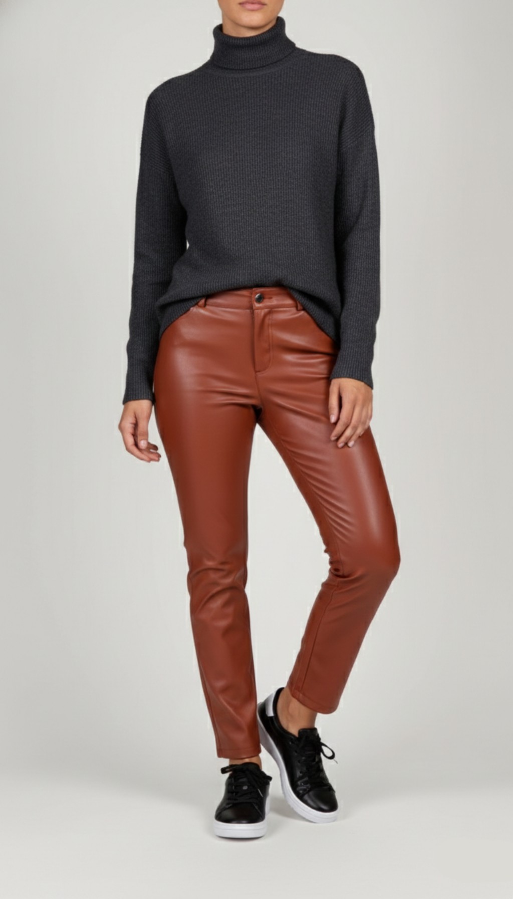 Este outfit captura la esencia de las tendencias otoño 2026 al fusionar un sweater de cuello alto en gris grafito con pantalones de efecto cuero en tono terracota, integrando así los colores otoño invierno 2026 más vibrantes con básicos neutros. Como uno de los looks otoño mujer más versátiles, la clave del éxito reside en cómo combinar colores otoño para que el calzado sea el protagonista; en este caso, unas zapatillas urbanas en cuero negro que no solo aportan comodidad, sino que ofrecen una infinita posibilidad de combinar con los colores de moda 2026, logrando un equilibrio visual perfecto entre sofisticación y estilo urbano.