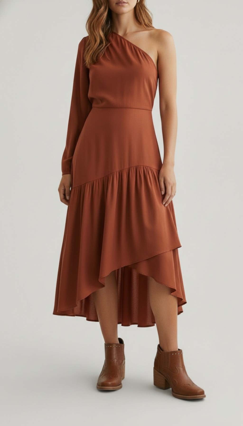 Este look es la definición perfecta de la sofisticación moderna para la temporada, combinando la fluidez de un vestido asimétrico en tono terracota con la fuerza de un calzado que se roba todas las miradas. El diseño de hombro descubierto aporta un aire fresco y vanguardista, pero el verdadero protagonista es nuestro botín de cuero artesanal, una pieza clave que equilibra la delicadeza del outfit con su carácter urbano. Estas botas no solo destacan por su color suela profundo que armoniza con la paleta otoñal, sino también por sus detalles de costuras ornamentales y tachas metálicas en el borde superior, que le dan ese espíritu rebelde y chic que buscamos hoy. Su taco robusto en acabado madera no solo garantiza una pisada firme y cómoda para todo el día, sino que eleva el look visualmente, demostrando que elegir el calzado correcto es el secreto para transformar un vestido relajado en una declaración de estilo absoluta.