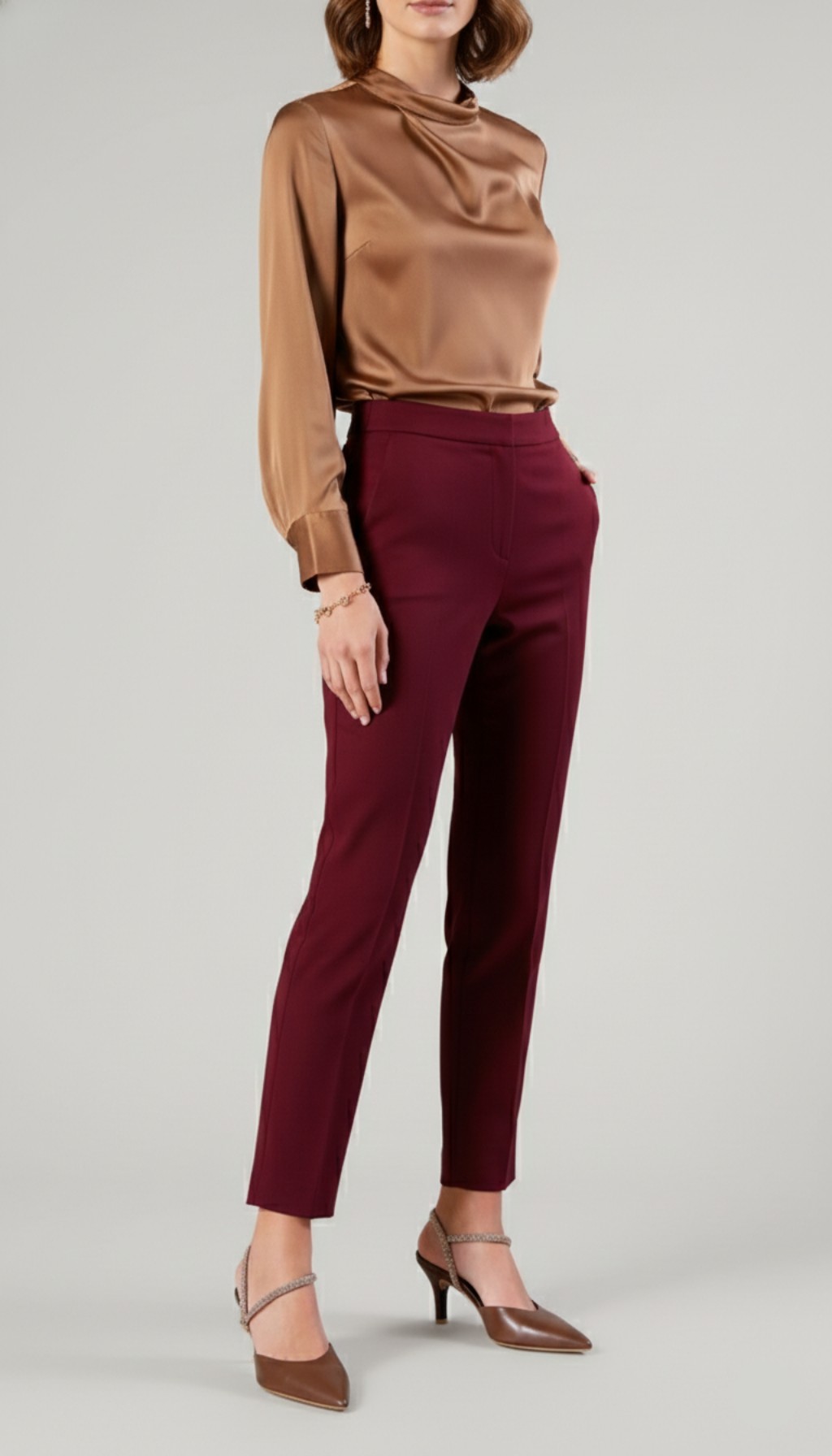 Este conjunto es la máxima expresión del lujo moderno para las noches de la temporada, donde la sofisticación se encuentra con el diseño de vanguardia. La combinación de una blusa de satén en tono cobre con caída fluida y un pantalón de vestir en color borgoña profundo crea una armonía visual que define las tendencias otoño 2026. Sin embargo, el verdadero secreto de este look reside en el calzado: unos stilettos en cuero chocolate con pulsera joya que no solo estilizan la figura, sino que añaden ese toque de brillo irresistible para cualquier evento nocturno. Al dominar cómo combinar colores de moda 2026 como el tierra y el vino, logramos un outfit que respira confianza y elegancia, demostrando que la posibilidad de combinar texturas satinadas con un calzado de autor es la clave para destacar en los looks otoño mujer más exclusivos de este año.